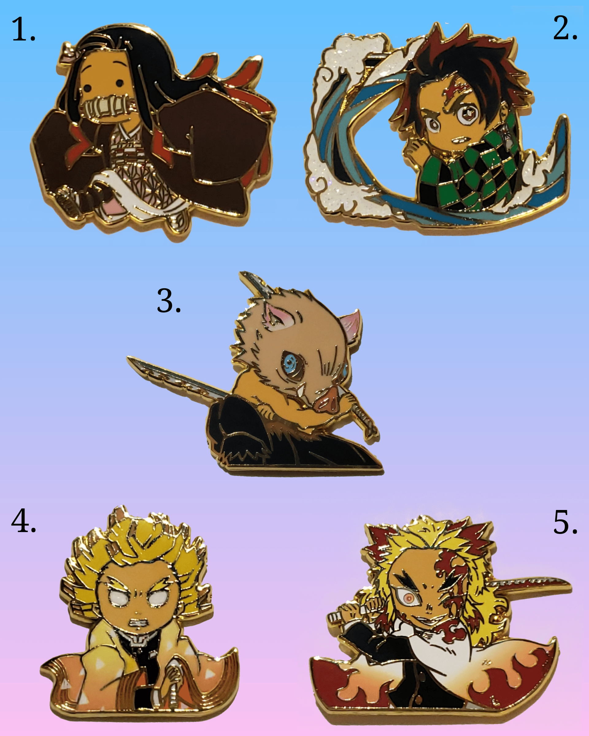 $7.00/ea or $32.49/set of five • Demon Slayer/Kimetsu no Yaiba Pins • Five characters to choose from • Use on bags, clothing, or for display • Material: Metal • Size: Approx. 1.5 in. tall, and 2 in. wide • Great gifts for Demon Slayer fans